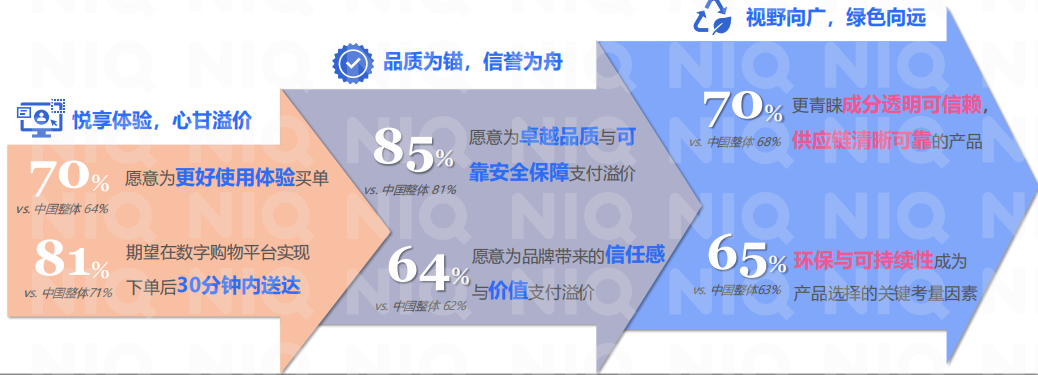 千禧一代将“体验”视为消费决策的第一入口,唯有极致的使用体验才能率先捕获其注意力,而扎实的品质则是将兴趣转化为信任的关键。81% 的人期望下单后30分钟内送达(高出整体10%),70% 明确愿为更好的体验支付溢价。然而,短暂的体验愉悦若没有扎实品质支撑,便无法转化为长期信任。因此,他们同时高度重视品质与安全,85% 愿为此支付溢价,81% 看重供应链的清晰可靠。