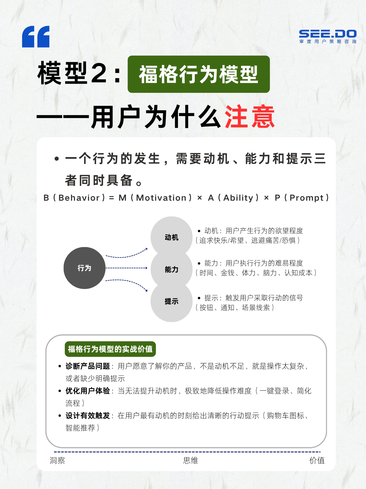 我们整理了五大核心模型:• JTBD模型:洞察真实需求• 心理账户:理解决策逻辑• 福格行为:优化用户体验• 上瘾模型:提升产品粘性• AIPS模型:量化用户资产一套完整的用户认知方法论助你从数据看到本质从功能设计走向价值创造