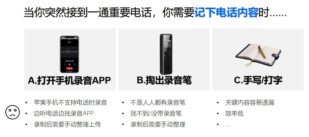 深入分析就会发现,问题的核心不在于"记录"这个动作本身,而在于:1.即时性:如何及时捕捉关键信息?2.便捷性:如何让记录动作不影响正常的交流节奏?3.可用性:如何让原始记录快速转化为可用的信息资产?这个看似简单的"小麻烦",实际上困扰着全球数以亿计的商务人士、专业人士和知识工作者。律师会谈中的关键证词、商务谈判里的重要承诺、媒体采访时的核心观点......这些高价值信息一旦流失,带来的损失往往难以估量。